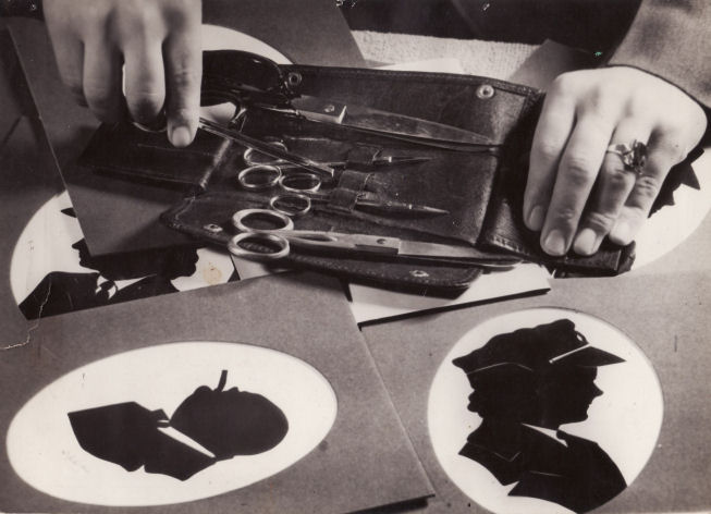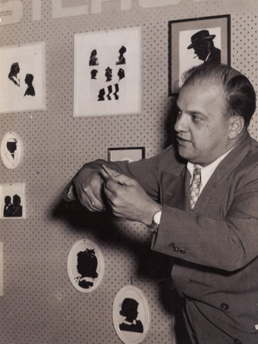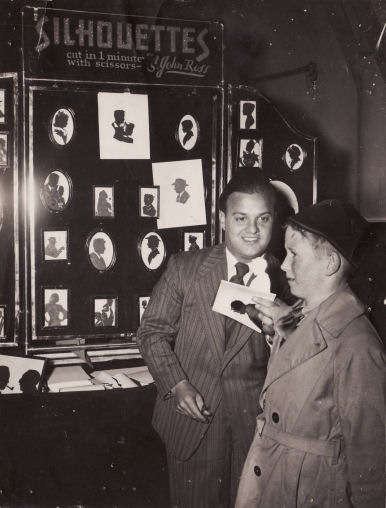 S. John Ross cutting a silhouette in 1944 with a few admirers watching on