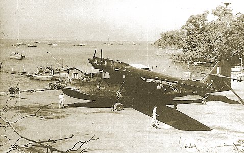filling holes left by 'popped' rivets in the hull. We learned later that he had paid the islanders 80 Dutch Guilders for each of us. We also found out later that they had tried to come for us the day before. (Note. It was another Catalina with a different crew, and a very experienced Skipper, Squadron Leader W.K. Bolitho, who, according to the official log book entries, had taken off from Darwin, but found that the seas in the crash area were running too high, and it was far too dangerous to attempt a landing). The next morning, the sea at Darwin was still running high, but we made it after 3 attempts with water breaking over the windshield. (Note. The recorder, First Engineer Sgt. Keith E. Hamilton still remembers this well!) I don't remember much of the getting to, or getting into the Cat, except that it was very hard for Mendish, because of the pain from his smashed shoulder. After takeoff one of the rescue crew gave me a heavy white bread onion and cheese sandwich, - it tasted very good ! I don't remember eating or drinking anything while on the island. When the Japanese invaded Indonesia, they were postulating 'Freedom with Prosperity' for their little brown brothers in greater East Asia. Initially many Indonesians warmly welcomed the Japanese as a way of getting out from under the yoke of Dutch colonialism, but after a time, they realised that the Japanese were acting more like conquerors and occupiers, and that this 'Freedom' was losing it's glow. Our warm reception by the islanders, was certainly very much due to the Japanese taking their young men away as non- volunteer forced labourers. Fortunately for us, we were the beneficiaries of this changing attitude. From our Group, we were the first survivors of downed aircraft to get out of enemy territory. The Catalina is a very unique aircraft, capable of taking off and landing on the open ocean under reasonable circumstances, and with extended flight time etc. but a low cruising speed of much less than 100 Miles Per Hour, which makes it vulnerable to attack, and this slowness, with the extremely low operational altitude necessary on this operation, plus the complete lack of Intelligence data regarding the Japanese occupational activity in the area , made this rescue a very risky undertaking. Serua Island was 425 miles from the Cat's forward base at Darwin at this time, and 150 miles inside a chain of islands, Japanese occupied and based, running 1500-2000 miles from Java and Timor in the West, to New Guinea in the East. These Japanese controlled islands were a randomly scattered, loosely linked chain, with some of the islands overlapping in the East West direction. In the mid section, none are more than 20 East West miles apart, - a rather solid 'fence' that facilitated the enemy's control and observation, many miles out to sea. On this rescue mission, our Cat had to penetrate deep into enemy territory, in broad daylight, find us, land, retrieve us from the beach, - take off, and fly back, all the while under potential observation and/or attack. These gutsy Aussies personify the meaning behind the phrase, 'Comrades in Arms' ; - God bless Them ! Aid and cover support was furnished by Beaufighters in pairs, but they were at the limit of their range from their Darwin base, so for part of the mission, a pair of fighters took off every 20 minutes, in order to sustain the continuous 2 fighter cover. - Typical in war ; using equipment designed for different geography, a totally different war in Europe, where the English Channel is only 22-25 miles wide. |