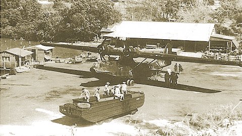 BOAT OPERATIONS The saga of the Catalina in it's role of the RAAF'S LONG RANGE STRIKE AND MINELAYING FORCE had it's origin in Port Morseby in the early1940's. This was when 11 Squadron was re-equipped with the newly arrived Catalinas from America in March '41, and subsequently when 20 Squadron was formed, also equipped with Cats. Although the name of the squadrons never changed from General Reconnaissance (G R) an addition to this role did when six aircraft, three from each squadron, set out for the first raid on Japanese positions, staging through Manus and Kavieng respectively, to attack the Japanese Naval installation at Truk in the Carolines. From then on bombing attacks continued as the Japanese advanced southward until many targets such as Rabaul, Kavieng, Lae, Buka and Buna were covered. After heavy bombing attacks on Moresby made that base untenable, 11 and 20 Squadrons were relocated back to the mainland, first to Bowen then shortly after, to Cairns. From there they continued their mainly bombing operations until April '43 when part of their effort was allotted to the new role of "minelaying". On the 22nd of that month eight Catalinas from 11 & 20 departed Cairns, each carrying two 2000 lb mines to lay them in Silver Sound in the approaches to Kavieng. Thus began a new era for the "Catalina Force". In September '44, 20 squadron was relocated to a new base, East Arm at Darwin, from where it operated until the end of the war. At the same time 11 Squadron was relocated to Rathmines. Meanwhile 43 Squadron had been formed at Karumba, in the Gulf of Carpentaria, and relocated in April '44 to Darwin. At Darwin the unit was first housed on the Airfield but then moved to facilities at Doctor's Gully. A third squadron, number 42 also equipped with Catalinas, was formed about this time and located at Melville Bay on Arnhem Land just East of Darwin. The three squadrons formed number 76 Wing with Headquarters located at Doctor's Gully. After the introduction of mines in April '43 the bombing effort of the Catalinas would gradually decrease until the three squadrons were virtually totally committed to the minelaying campaign with singular success. However, the General Reconnaissance role was not lost and the occasional supply drop, sea reconnaissance, and sea rescue was undertaken. From Darwin the Catalinas of the Wing ranged over the whole of the then Netherlands East Indies (NEI) from Sourabaya and Banka Straits in the West, to Irian Jaya in the East and North to Borneo, the Halmaheras and the Celebes. All mineable harbours and roadsteads were sowed with mines and Japanese shipping was dislocated to the extreme. To reach some of these targets it was often necessary to refuel at forward staging bases such as West Bay and Yampe Sound. In addition American seaplane servicing ships in forward areas were used for this purpose. Towards the end of the war our aircraft staged north through the Philippines, at Leyte Gulf and Lingayen, to mine ports on the China coast including Hong Kong the Pescadores and Wenchow, 28 degees north latitude - the most northerly penetration of any RAAF aircraft in the war in the Pacific, and so made history. One particular highlight of the campaign was the mining of Manila Harbour when 27 Catalinas left Darwin to rendezvous in Leyte Gulf for the task. On this occasion the Wing was augmented by 6 aircraft of 11 Squadron flown up from Rathmines. The object of the operation was to bottle up the Japanese Fleet in Manila pending General MacArthur's invasion of Mindoro. This operation was completely successful and the object achieved. Another "Cat" unit, 112 Air Sea Rescue Flight, provided cover for Liberator strikes and various other tasks. RAAF "Cats" were the first to bomb Japanese installations after the downward thrust to New Guinea, they were the first to bomb Japanese occupied ports from the Netherlands East Indies to the China Coast, they were the first in and last out in the evacuation of our prisoners of war at the cessation of hostilities.