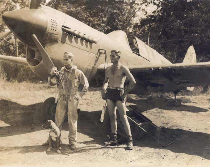 Des Alexander and Dutch pilot Henk Levy with his P-40 Kittyhawk and pet dog "Wodan" in Merauke