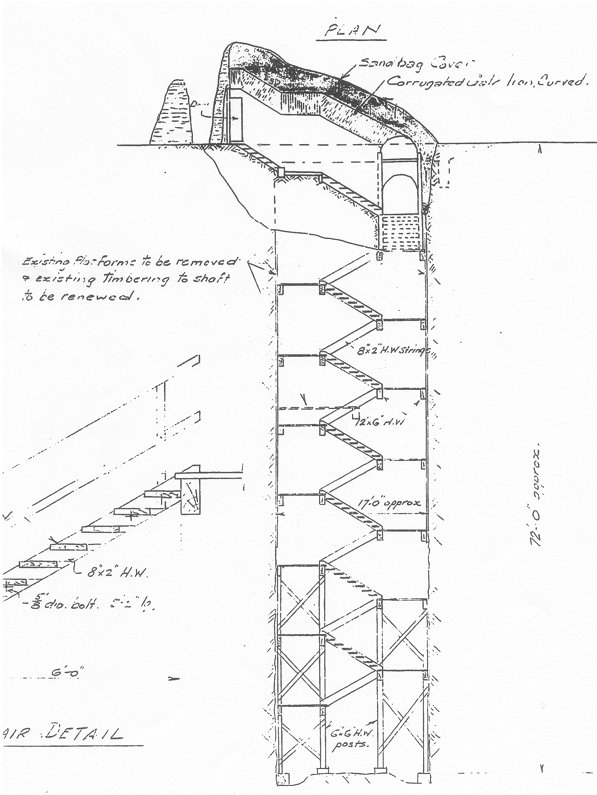 The drawing seems to indicate that the existing platforms were to be removed and existing timbering to the stair shaft were to be renewed suggesting that this structure had existed for some time. Some notes on the drawing mentions "ARP Entrance" and "Splinter Proof".