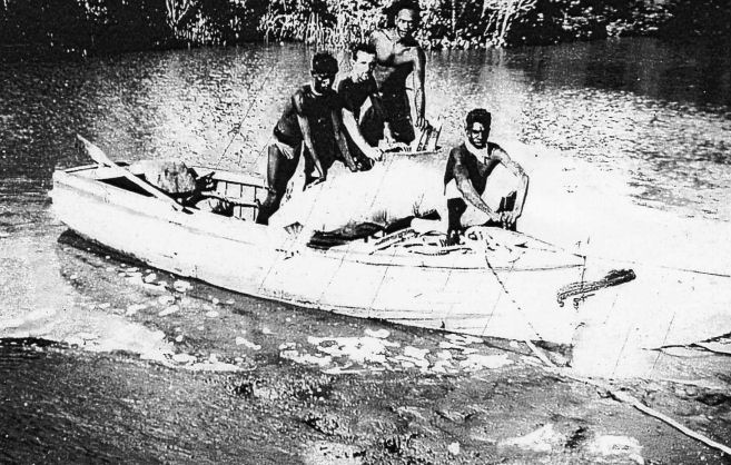 One day a few of us were enjoying ourselves in a fresh water swimming pool we found 4 or 5 miles inland when a lone native appeared on the bank and started to wave us out. We didn't understand at first, but we always took notice and we obeyed. He made us realize there was a crocodile on the bottom.