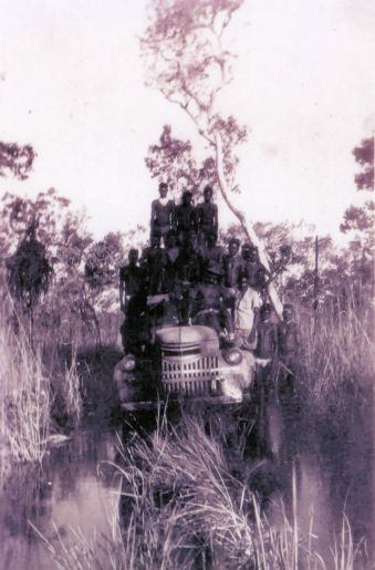 At the mission a very large crocodile was seen leaving its tracks near the married quarters and it was traced to the nearby river. Father Docherty contacted us and we drove our Blitz Buggy down to river with a machine gun mounted on the hatch of cabin roof. The tender was parked on a steep bank and we waited but didn't see it all that day. So the following day the natives decided to bait it to see if they could get it to rise from the bottom of the river. We couldn't believe our eyes!!! They tied a rope around the waist of small boy about five or six years old and tossed him in the river slowly pulling in; this they repeated for some time and would you believe it up came the crocodile. The area was quickly cleared and we opened fire hitting it several times killing it.