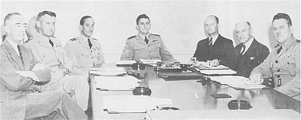 The Air Board on 26 June 1946 L. to R. - W.L. Brown (Finance Member), A.V.M. E.C. Wackett O.B.E. (Air Member for Engineering and Maintenance), A.V.M. J.E. Hewitt O.B.E. (Air Member for Personnel), A.M. G. Jones C.B.E., D.F.C. (Chief of Air Staff), F.J. Mulrooney (Secretary Air Board), R.H. Nesbitt (Business Member) and A.V.M. G.J.W. Mackinolty O.B.E. (Air Member for Supply and Equipment) |