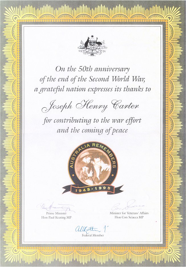 In mid 2002, Joseph Carter's family received a Certificate of Thanks for his service to the V.A.O.C. from the Australian Federal Government on the 50th anniversary of the end of the Second World War.