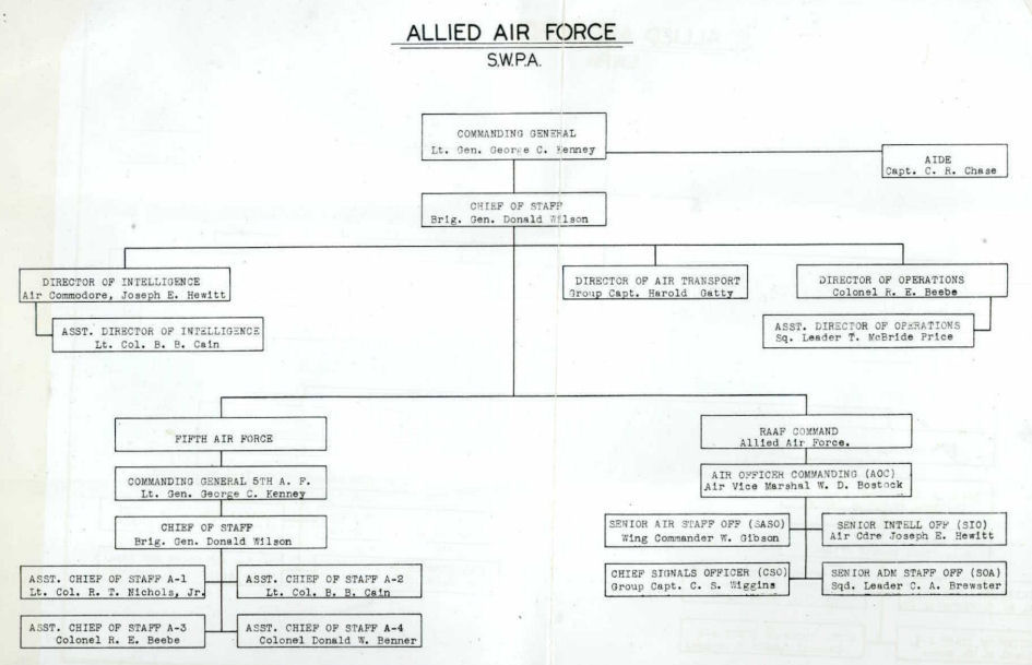 Upon assuming his command, the Commanding General, Allied Air Forces, made the following senior appointments of R.A.A.F. officers to the staff of Headquarters, Allied Air Forces, Southwest Pacific Area, by the issue of A.A.F General Order No. 4Air Vice-Marshal W.D. Bostock, C.B., O.B.E. Chief of Staff