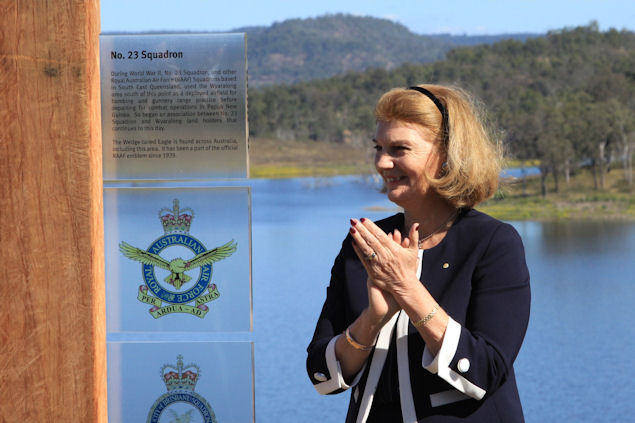 On 24 June 2011, the Governor of Queensland, Ms Penelope Wensley AC, unveiled a bronze sculpture of a Wedgetailed Eagle and a Memorial plaque dedicated to the WWII connection of 23 Squadron RAAF to Wyaralong at the new Wyaralong dam site. Two F/A-18 Hornets flew overhead and a Wedgetailed Eagle circled overhead. The ceremony was covered by the Channel 10 Brisbane TV News.