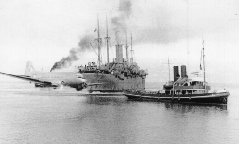 238 Squadron Dakota flying past the SS Sontay in the Outer Harbour