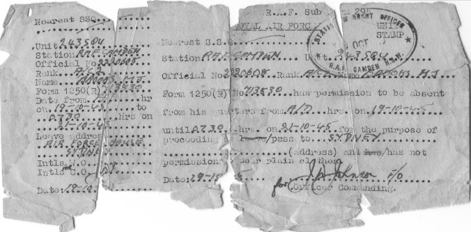 Leave pass dated 19 October 1945 for a trip to Sydney which was signed by a J. D. Johnson F/O.
