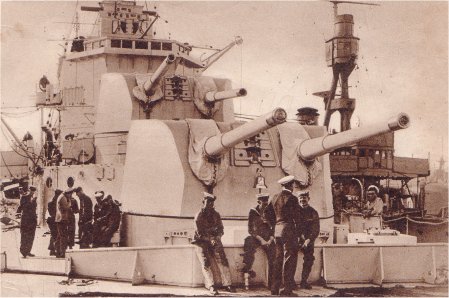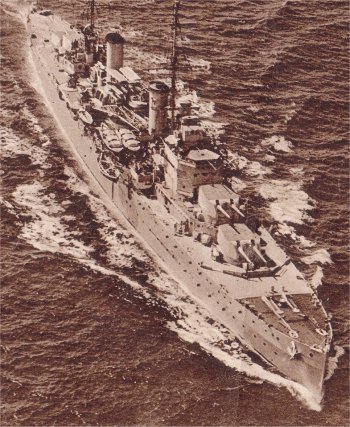 HMAS SYdney II was 560 feet long, 57 feet wide, had a 16 foot draught and was 8,850 tons loaded. Propulsion was by 4 shaft Parsons Turbines developing 72,000 shaft horsepower, she carried 1,800 tons of fuel oil which gave her a range of 10,300 miles at 14 knots. Her maximum speed was shown as 32.5 knots, complement was 570, main armament was eight 6 inch Mark 23 guns, she had auxiliary armaments of four 4 inch Mark 5 guns, four 4 inch Mark 16 guns, three four barrelled 0.5 inch Machine guns and 2X4 21 inch torpedo tubes. She carried one 620hp Walrus reconnaissance amphibian, her deck armour was 1.25 inches, gun turrets had 1 inch armour, bulkheads 1.5 inch and 3.5 inches in the magazines.