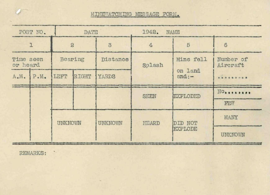 The object of the Minewatching organisation was to locate the position of mines dropped in rivers or coastal areas from enemy aircraft, so that action could be taken to clear the shipping channel with minimum delay and to prevent movements of ships in known danger areas.