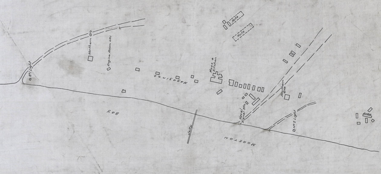 In early 1942 the Queensland Main Roads Commission was directed to erect buildings, anti-aircraft gun emplacements, command and battery observation posts, underground plotting room, magazines, accommodation for officers and men, a 20,000 gallon concrete tank, and a 20 bed hospital at Cowan Cowan (aboriginal Kau-in Kau-in) on Moreton Island for Cowan Battery. There were also instructed to build a Controlled Mine Station with accommodation for officers and men of the Royal Australian Navy which became RAN Station 3 Controlled Mining and Guard Loop Station.