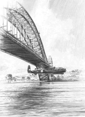 During a 1943 tour of Sydney, Lancaster ED930 (A66-1) "Q" for Queenie VI, piloted by Flt. Lt. Peter Isaacson, "beat up" the city of Sydney and flew under the Sydney Harbour Bridge, on 22 October 1943 to raise funds for the War Loan. The media claimed He did it for the £iberty £oan!