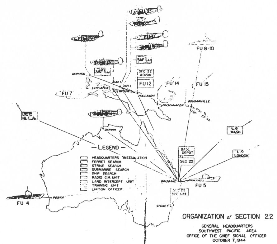 "Section 22" was responsible for collecting information on Japanese radar and radio systems, analysis, dissemination of the resulting intelligence and requisitioning and assigning electronic countermeasures/reconnaissance personnel and equipment. By mid-1943 USAAF B-24D Ferret aircraft had been assigned to the Southwest Pacific Area, and "Section 22" started to assemble a detailed picture of the Japanese radar network in the area. "Section 22" soon realised the effectiveness of operations using dedicated AAF Ferrets and soon forced the US Navy into a similar mode of operation.