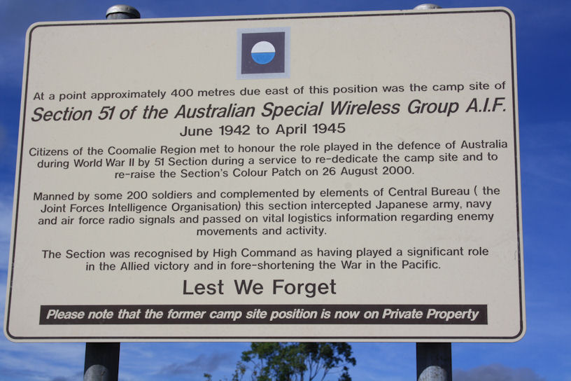 51 Wireless Section was one of the 11 Field Sections of the Australian Special Wireless Group, AIF. They were part of MacArthur and Blamey's new top-secret intelligence unit called Central Bureau which comprised Australian Army, RAAF and US Army personnel. They were stationed at Coomalie Creek near the airfield from 1942 until 1945.