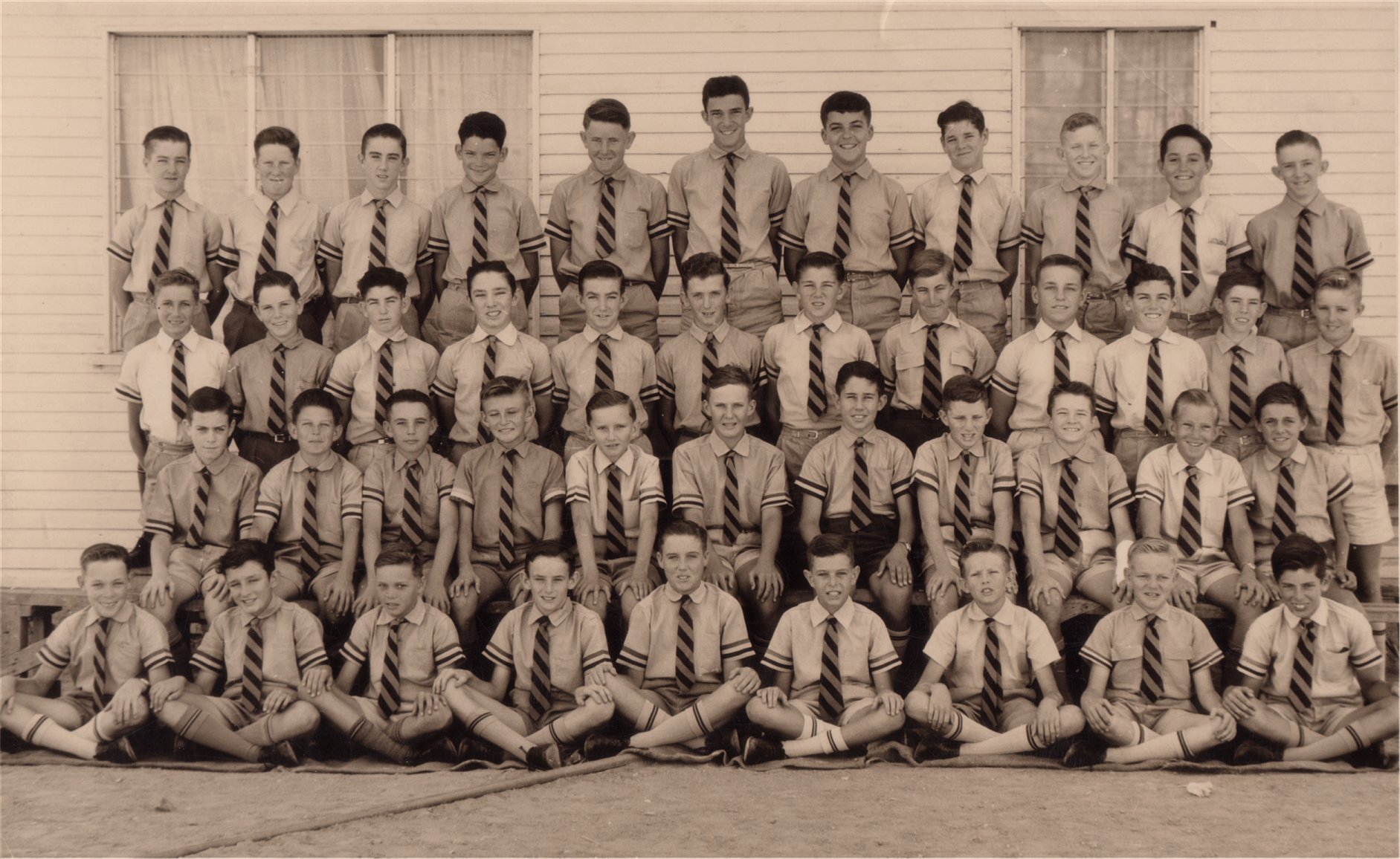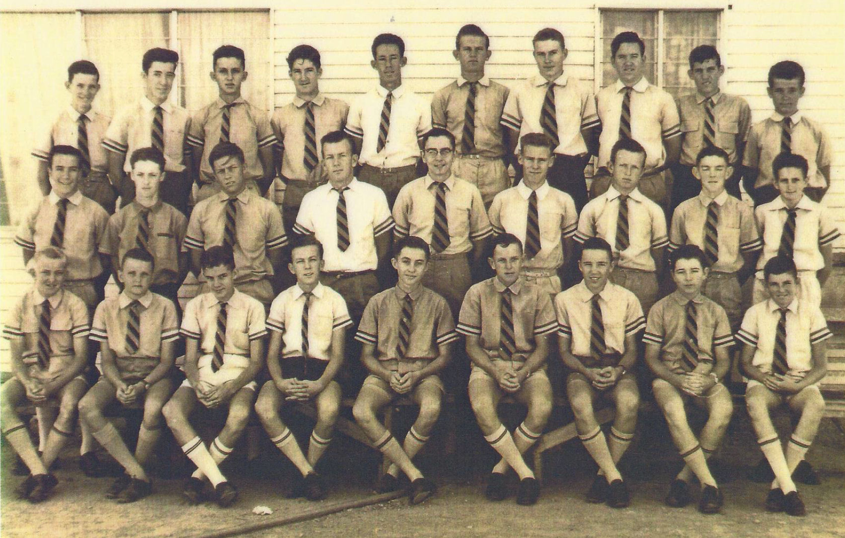 Names Left to right:- Front row: Doug Frew, John McGhie, Graham White, Mick Palmer, Noel Hartigan, Graham Bannan ("Chookie"), Michael Finey, Eamon Mythen ("Mythen the Python"), Billy Cosgrove 2nd Row: John Rush ("Jack"), John Snee ("Snee Bomb"), Colin Stout, John Adams ("Bomby"), Peter Dunn ("Dunny"), Anthony Feeney ("Chas, Chasback, or Jasper"), William Archer ("Billy"), Robert Jones ("Bob"), John Murray ("Murphy"), Russell Bourke, Peter White 3rd Row: John Turner, Thomas Hardy ("Hardrock"), John Donaldson ("Ducky"), Noel McGrath, Ron Webb, Leonard Lennon ("Lennie"), Paul Firth, Robert Wilesmith, Philip Rogl ("Froggy"), Ray Hurley, Paul Rush ("Specks"), Gene Rooney Back Row: Rodney Costigan, Thomas O'Mara, John Bourke, Len Costello, Ian McGeachin, Philip Quilliam, Michael Hanran ("Mike, Mick, or Bert"), Thomas McArdle ("Tom"), John Smith, Roger Degiovanni, Peter Cashin Absent: Daniel Fayers ("Danny"), Gordon Leishmann, Dennis Lambrose, Michael Downey ("Mick"), Peter Hart, Christopher Hiles, Robert Morrow, Patrick "Paddy" Peppin (were there others?) Teacher: Brother D. D. Beatson ("Don or Bill") |
