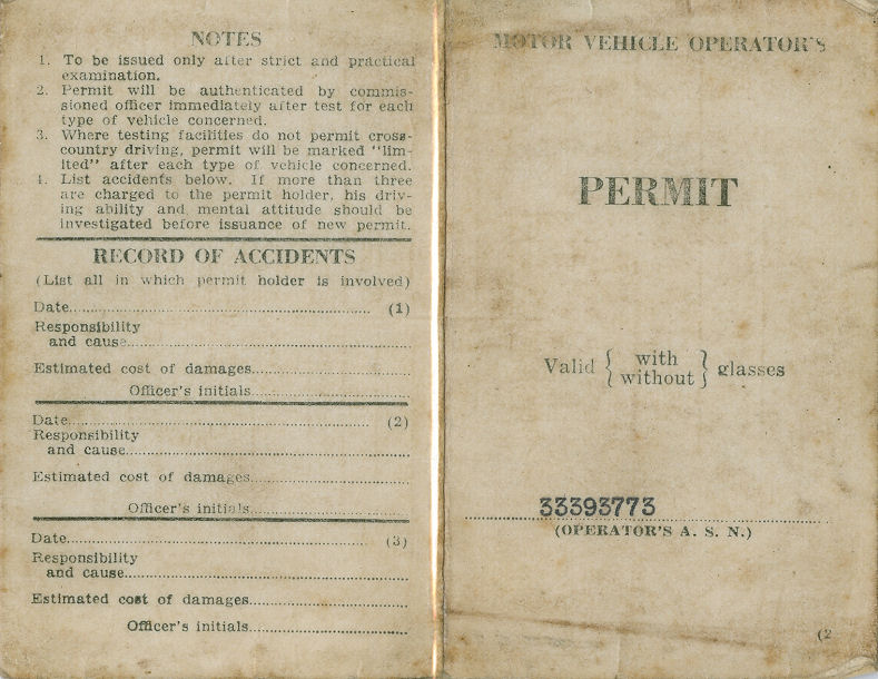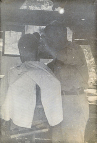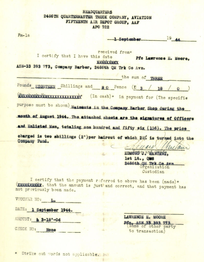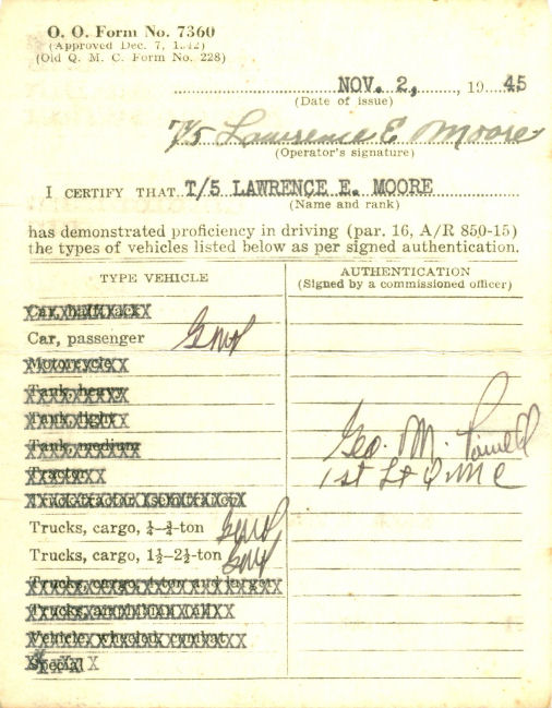 Pfc Lawrence E. Moore, Jr. was also the Company Barber. Lawrence's son, Terry L. Moore, has a photo of his father cutting hair and also has a copy of the form used to turn in the money collected in the barber shop. Terry also has his original father's Motor Vehicle Operator's Permit.
