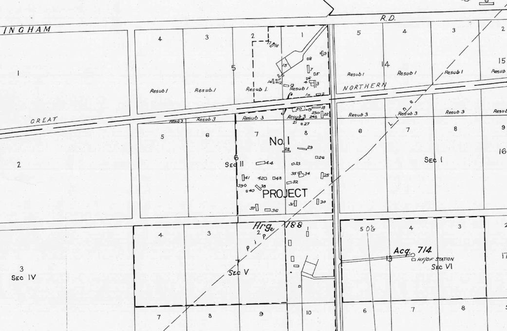 The US Air Force Aircraft Erection Depot was built as Project No. 1 in Townsville in early 1942. It comprised one large hangars and a number of smaller buildings as per the plan below.