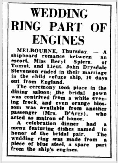 During the voyage to Australia Beryl met and married a Scotsman, Lieutenant John Drysdale Stevenson of the Manchester Regiment, the Fortress Troops at Singapore. Beryl returned to Wagga after she had placed her 15 children with either relatives or foster parents.