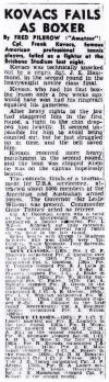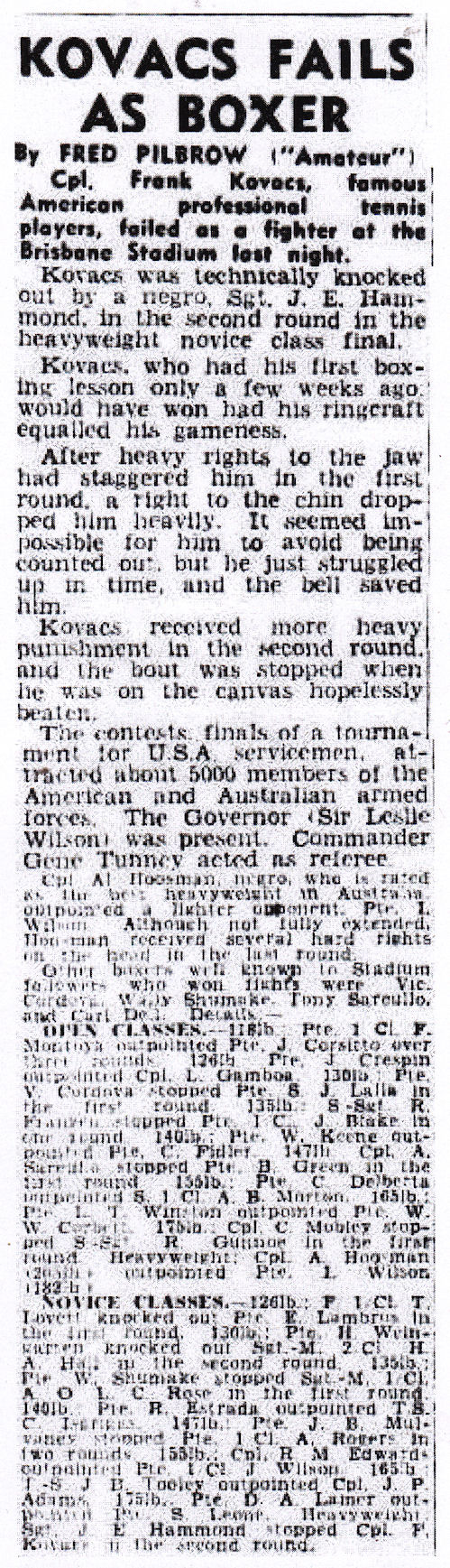 One of the boxers that fought at the Brisbane Stadium on the evening on 13 December 1943 (see above newspaper article), was Corporal Al Hoosman. At that time he was considered to be the best heavyweight fighter in Australia. The evening was the Finals of a boxing tournament for US servicemen. About 5,000 American and Australian service personnel attended the boxing matches that night. The Governor of Queensland Sir Leslie Wilson was in attendance at the matches and U.S. Navy Commander Gene Tunney was the referee.
