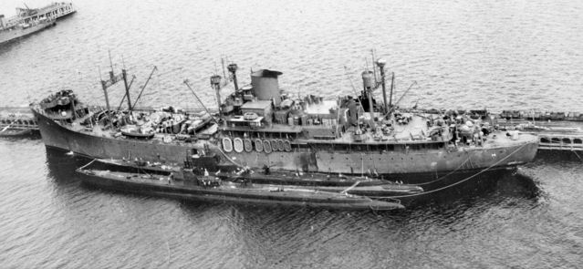 USS Pelias was a Griffin Class submarine tender with the US Navy that saw service in various locations in Western Australia during WWII. USS Pelias was originally built as SS Mormacyork which was launched on 14 November 1939. After a short time providing a passenger service between ports in USA and South America, it was acquired by the US Navy in late 1940 and renamed USS Pelias on 9 January 1941. She was converted by Bethlem Steel Co., at Brooklyn, N.Y. as a submarine tender and was commissioned at New York on 5 September 1941. She was known as "Polly Pelio" by her crew.